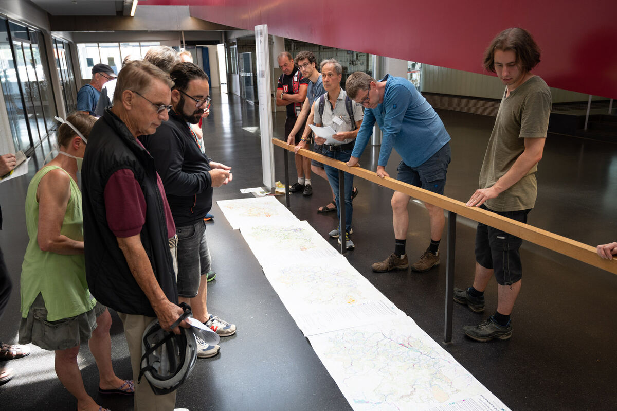 In der Tonnenhalle erläuterten Peter Seiffert (im grauen Hemd) und Fabian Roser (dahinter) die Pläne zur Biotopvernetzung. Links im Bild Chris Kühn (mit Bart). FOTO: EBER