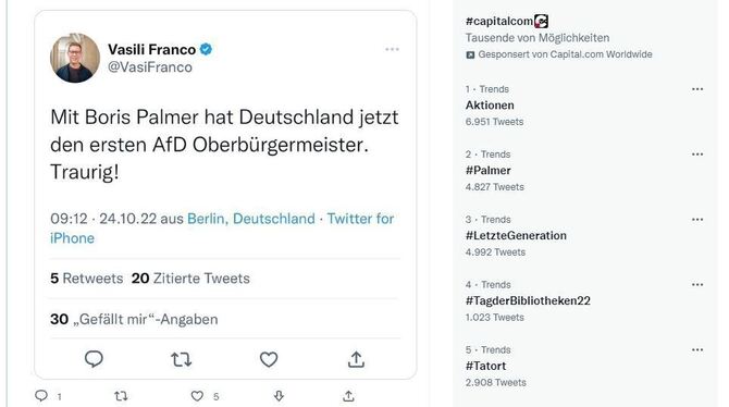 Der Berliner Grünen-Abgeordnete Vasili Franco hatte auf dem Kurznachrichtendienst geschrieben: »Mit Boris Palmer hat Deutschland jetzt den ersten AfD-Oberbürgermeister. Traurig!« Kurz darauf löschte er den Tweet und formulierte: »Es ist 2022 und Rassismus ist immer noch kein Ausschlusskriterium.« Er wolle die Debatte nicht weiter anheizen und werde sich öffentlich nicht weiter zu dem Thema äußern, sagte er der Deutschen Presse-Agentur (dpa). Auf Twitter erntete er für seine Worte viel Kritik. »So ein Bullshit, lieber Vasili! Meine Güte«, schrieb etwa der Grünen-Bundestagsabgeordnete Konstantin von Notz. FDP-Politiker Rudi Rentschler kommentierte: »Bei deinem Nachname bist du eher der Faschist.«