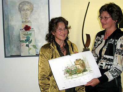 Bilder an der Wand und im Kalender: Livia Scholz-Breznay (links) und Bärbel Neu bei der Eröffnung der Ausstellung.