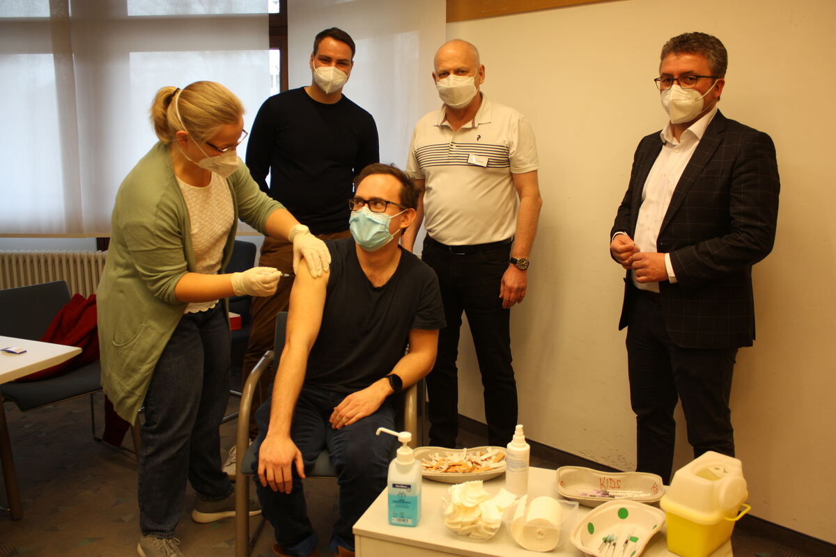 Elisabeth Plöchinger impft Johannes Pawlowski im Mössinger Impfzentrum. Dahinter von links: Sebastian Schmidt, Gerhard Hölldobler und OB Michael Bulander.