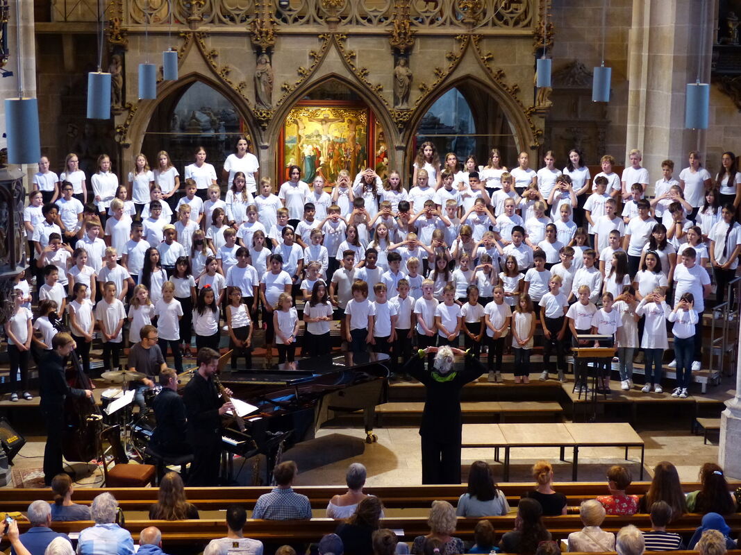Mit Bewegung und Gesten führte Friedhilde Trüün die Schüler durch das Konzert, begleitet vom Frank-Schlichter-Jazzensemble (links).