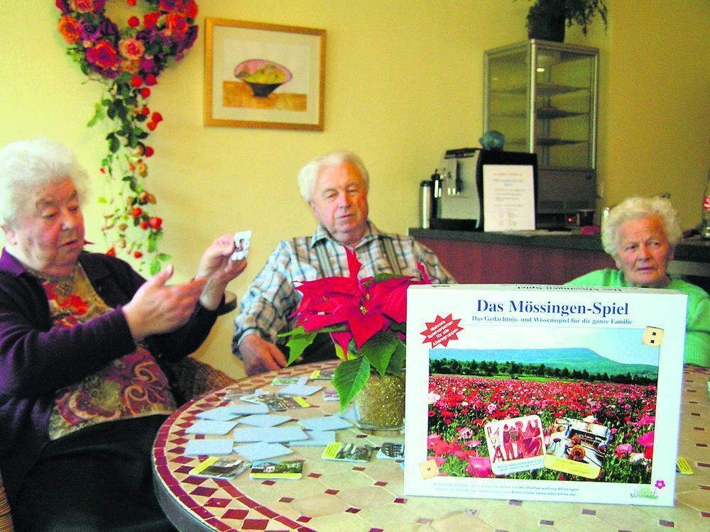 Eine bunte Kartenwelt mit schönen Mössinger Motiven erwartet die Spieler. FOTO: PRMaria Steinhilber, Karl Steinhilber und Maria Kohlstätter (von links) testen gemeinsam das neue Mössingen-Spiel - und wissen ungeheuer viel über die Stadt zu erzählen. FOTO: WEBER