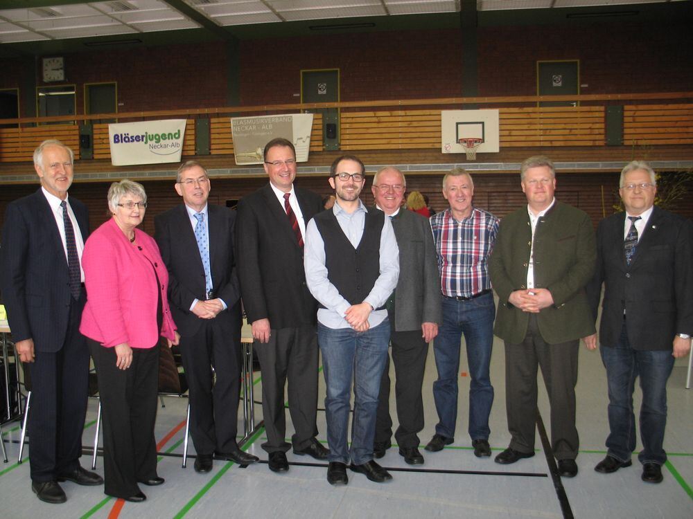 Beim Treffen in Tübingen-Pfrondorf: (von links) der Tübinger Landrat Joachim Walter, Jugendverbandsleiter Florian Mayer, der Verbandsvorsitzende Helmut Vöhringer, der Vorsitzende des Musikvereins Reutlingen-Degerschlacht und Mitarbeiter der neuen Geschäftsstelle, Klaus Digel, Verbandsdirigent Bruno Seitz und der Kreisvorsitzende für Reutlingen, Claus Dollinger. FOTO: BIJ