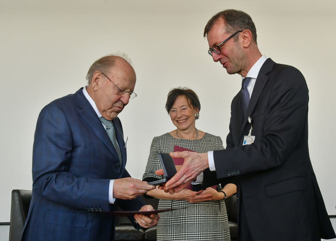 Dekan der Medizinischen Fakultät Ingo Autenrieth (rechts) überreicht Wilfried Ensinger die Leonhart-Fuchs-Medaille der Uni Tübingen für sein Engagement für das Zentrum für Seltene Erkrankungen (ZSE). Eva Luise Köhler hat ihre Auszeichnung bereits bekommen. FOTO: MEYER