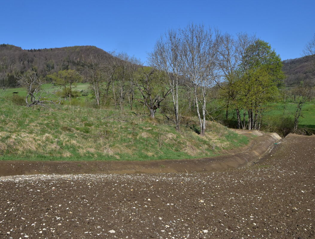 Auf der durch Drainagegräben entwässerten Rutschzunge stehen abgestorbene Obstbäume, die ursprünglich hundert Meter weiter oben am Hang wuchsen.