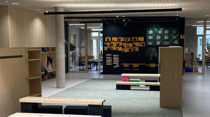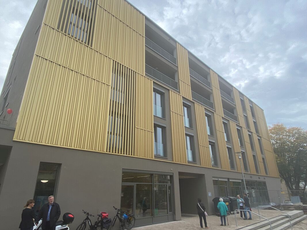 Trotz des trüben Herbsttages erstrahlt die Aluminiumfassade des Quartierhauses in Gold.
