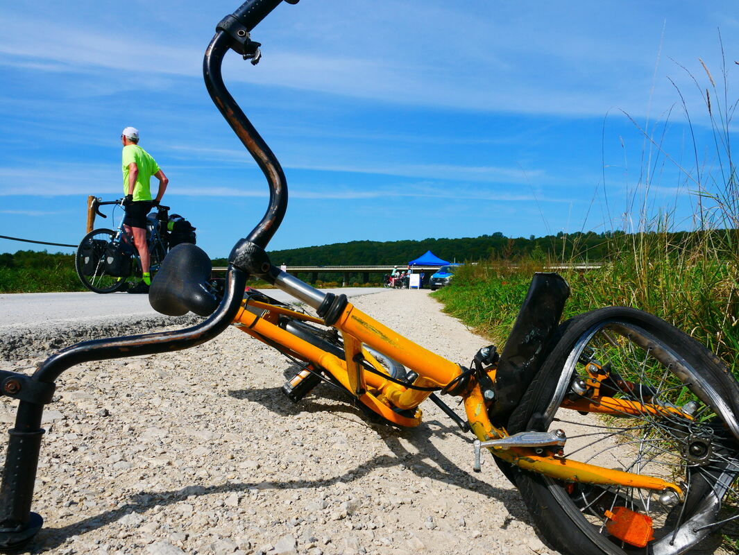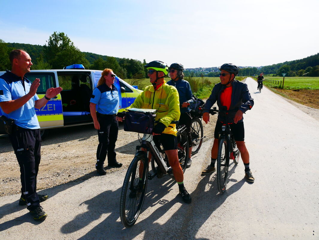 Zusammen mit seiner Kollegin, der ersten Polizeihauptmeisterin Stefanie Borzym, informierte er gestern am Rande des Radweges über die Gefahren beim Radeln – vor allem, wenn die Radler keinen Helm tragen. Um die Auswirkungen der Gefahren zu demonstrieren, hatten sie zwei demolierte Kinderräder mitgebracht und eines in jede Fahrtrichtung an den Rand des Weges gelegt – als Hinweis, als Mahnung, was so alles passieren kann. Und was tatsächlich passiert ist. Auf einem dieser Räder saß ein Kind als ein Lkw es überholte und das Vorderrad unter einen Reifen geriet. Man will sich nicht vorstellen, was dem Kind dabei passiert ist.