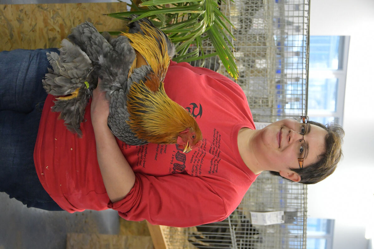 Zuchtmeisterin Sonja Biesinger mit ihrem bestbenoteten Zwerg-Brahma. FOTO: MEYER