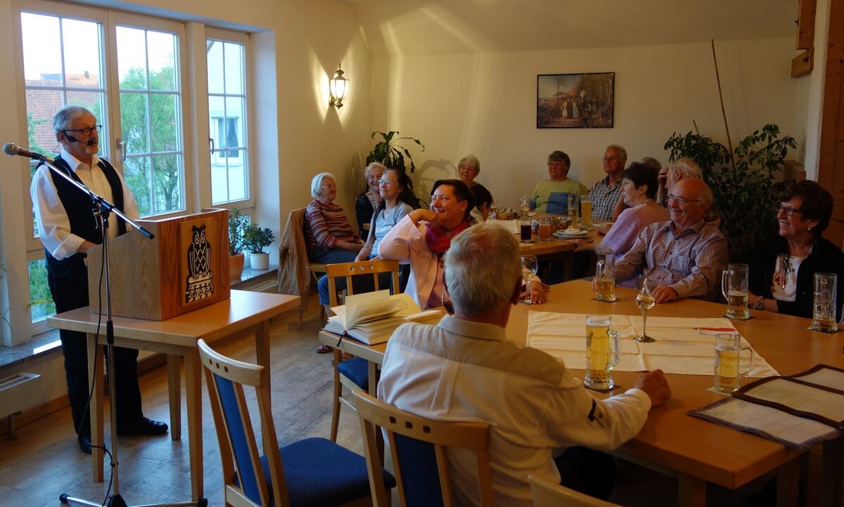 Walter Dreher (links) bringt mit Amüsantem und Hintersinnigem von Mundart-Dichter Josef Eberle alias Sebastian Blau sein Publikum zum Lachen. FOTO: STB