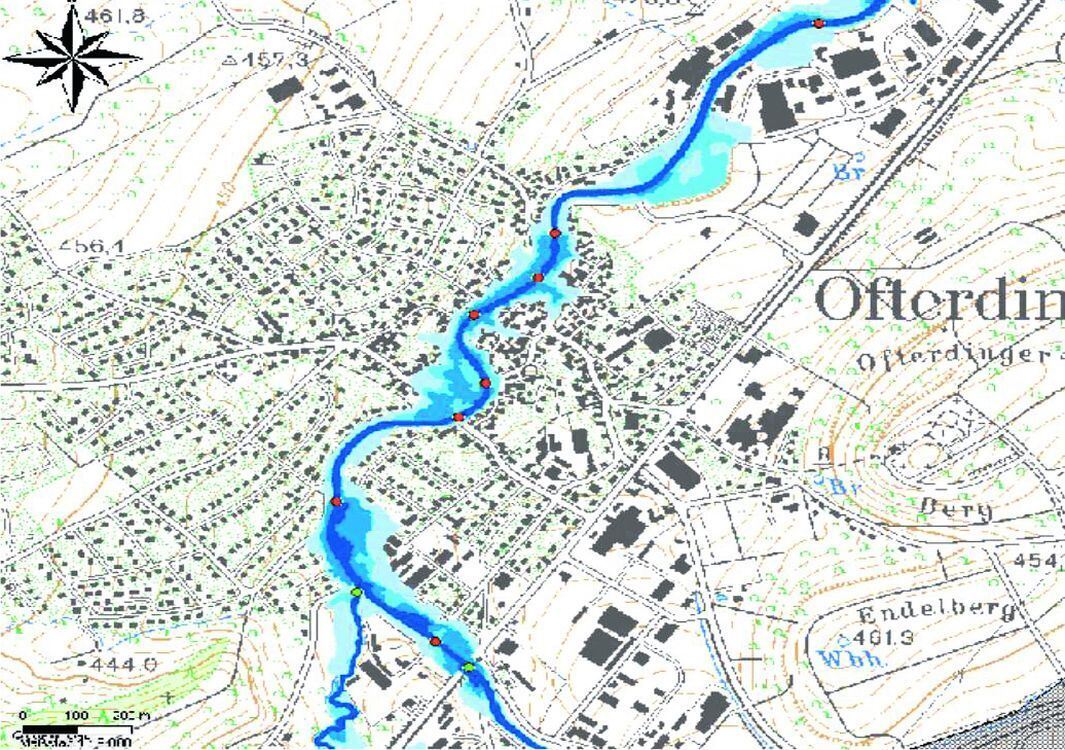 Blau markierte Überschwemmungszone: In den hellblau gefärbten Gebieten dürfen keine Bauvorhaben mehr genehmigt werden. Diese Areale werden bei einem alle hundert Jahre zu erwartenden Hochwasser überflutet sein – ebenso acht der zehn Brücken im Ort. GEA-REPRO