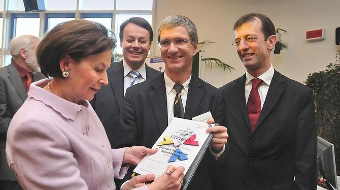 Die Unterschrift von Eva Luise Köhler, der Frau des Bundespräsidenten, ziert die Gründungsurkunde des neuen Tübinger Forschungszentrums für seltene Erkrankungen (ZSE). Ministerialdirektor Klaus Tappeser (von links), ZSE-Chef Olaf Riess und Medizin-Dekan Ingo Autenrieth präsentierten das Schriftstück nach der Gründungsveranstaltung in der Kinderklinik.