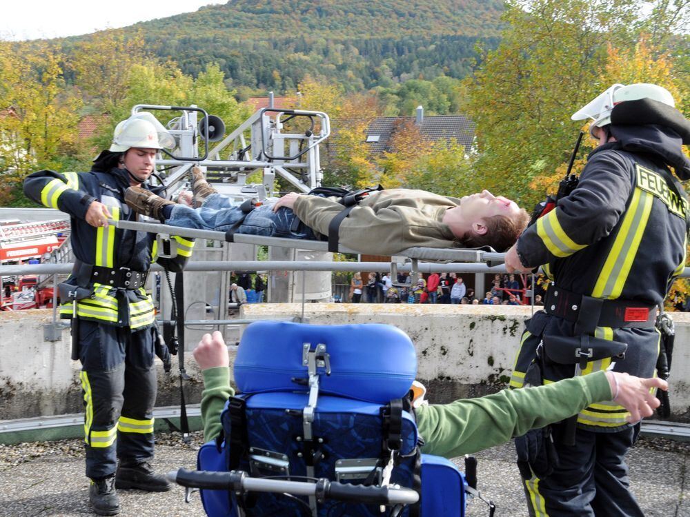 Die Feuerwehren machen sich bei Begehungen und bei Einsatzübungen mit den Örtlichkeiten von Behinderteneinrichtungen in ihrem Einsatzgebiet vertraut. Die Mössinger Gesamtwehr hatte im Oktober die Evakuierung von Menschen mit Handicaps in der Körperbehindertenschule durchgespielt. GEA-ARCHIVFOTO: MEYER