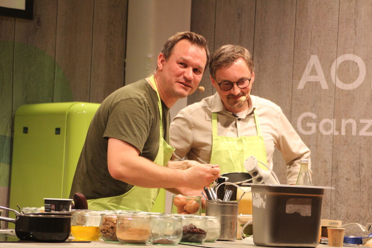 Simon Tress bereitete mit Gomaringens Bürgermeister Steffen Heß (rechts) eine Kürbissuppe vor.