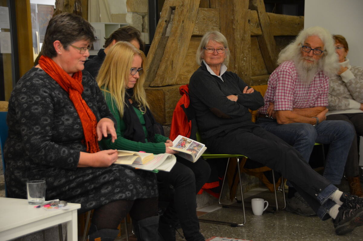 Ellen Noetzel (links) liest vor, während zu ihrer Rechten Karin Föll die Portraits der Hundertjährigen betrachtet. FOTO: GINGALLY