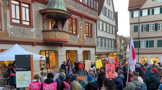 TÜBINGEN. Egal ob in der Bildung, beim Klima oder der Müllabfuhr - wie aus der Tübinger Haushaltsliste hervorgeht, plant die Verwaltung in vielen Bereichen den Rotstift anzusetzen. Dadurch sollen insgesamt 13 Millionen Euro eingespart werden - bei einem Haushaltsloch von 40 Millionen Euro. Gegen die bislang 234 Maßnahmen haben viele Vereine und Organisationen - vorne mit dabei der Deutsche Gewerkschaftsbund - zu Protesten aufgerufen. Bereits eine halbe Stunde, bevor Gemeinderat und Stadtverwaltung im Rathaussaal die Köpfe für intensive Verhandlungen zusammensteckten, versammelten sich Hunderte Demonstranten auf dem Marktplatz.