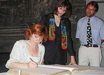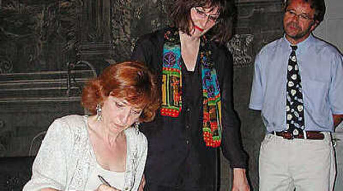 Eine Ministerin ist immer im Dienst: Noelle Lenoir beim Eintrag ins goldene Buch der Stadt, Tübingens Oberbürgermeisterin Brigitte Russ-Scherer schaut aufmerksam zu.