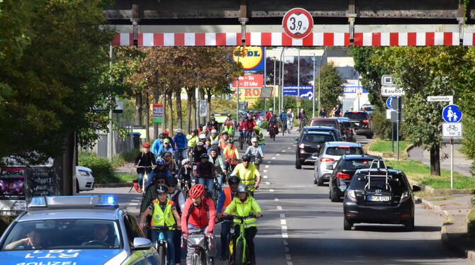Fahrraddemo unter der Eisenbahnbrücke für den Erhalt der Mössinger DB Agentur.