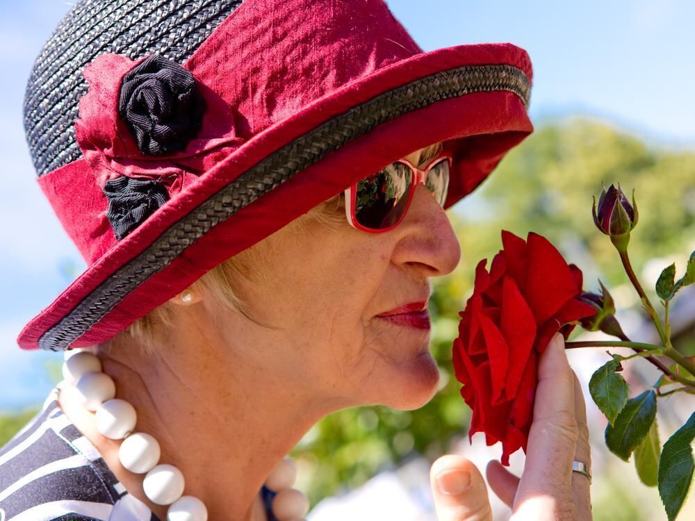 Prächtiges Wetter, prächtige Blumen: großer Besucherandrang beim Mössinger Rosenmarkt. Stöcke werden durch die Menge bugsiert, Ellenore Steinhilber genießt den Duft.