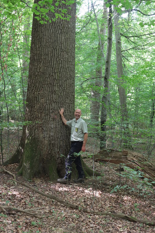 Fast dreihundert Jahre schätzt Förster Gerster das Alter der Eiche. Ganz in der Nähe hat sich der Buchbach ein tiefes Bett gegraben. Die Saumauer (mittleres Bild) ist direkt an der Waldgrenze. Darüber eröffnet sich ein weiter Blick auf die Alb. FOTOS: WALDERICH