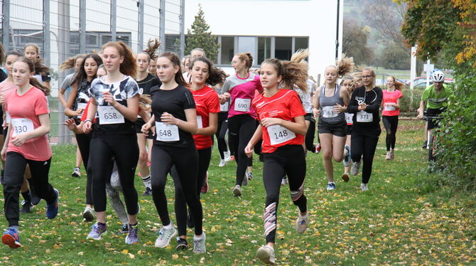 MÖSSINGEN. Wer oben auf dem Siegerpodest bei der Ehrung steht, kann sich besonders freuen. Nicht nur, weil es für ganz vorne Platzierte Preise wie Bälle, Trinkflaschen, Bücher oder T-Shirts gibt, die auf einem Tisch unweit der Listen mit den Startnummern ausgestellt sind. Aber einfach nur dabei sein, auf der Strecke mit anderen seinen Lauf zum Erlebnis machen, ist beim Crosslauf rings ums Firstwald-Gymnasium schon eine tolle Sache. Urkunden gibt es für alle Teilnehmer. Exakt 709 Startnummern gab es gestern. Je nach Altersklasse machten sich die Mädchen und Jungen auf eine 1 000, 2 000 oder 3 000 Meter lange, neue Strecke auf, die im Zickzackkurs mit »Cross-Charakter« um und übers Schulgelände führt. Das milde Wetter bot ideale Bedingungen. Neben Einzelwertungen waren die Leistungen von Klassen und Schulen gefragt. Ein Wanderpokal wartete auf seine Mitnahme. Laut Veranstalter hat sich der Crosslauf mit über 700 Läufern zum größten Schulsportevent im Regierungspräsidium Tübingen entwickelt. In diesem Jahr waren Schüler aus den Gymnasien in Balingen und Hechingen dabei, vom Firstwald-Gymnasium in Kusterdingen, der Jenaplanschule Mössingen, dem Quenstedt-Gymnasium Mössingen, dem Dußlinger Karl-von-Frisch-Gymnasium, der Geschwister-Scholl-Schule Tübingen sowie vom Carlo-Schmidt-Gymnasium Tübingen. Die Zeit wurde professionell mit Transpondern gemessen. (mwm)