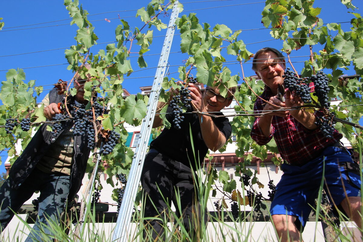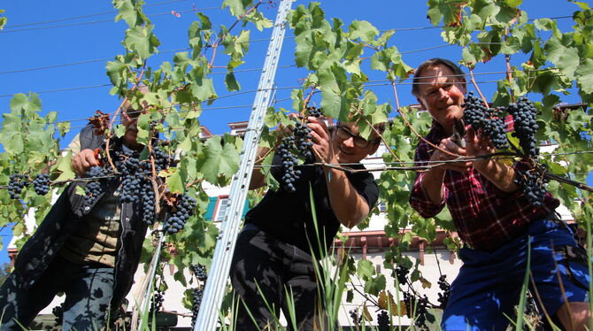 Die Pause war lang. Fünf Jahre. Seit der Hagelsturm 2013 über den kleinen Weinberg am Gomaringer Schloss hinweggezogen ist und die Rebstöcke schwer beschädigt hat, saßen die Freunde des Gomaringer Schlossweins auf dem Trockenen, und die Gemeinde hatte keine flüssigen Präsente aus eigenem Anbau mehr. Doch das Ende der Durststrecke ist absehbar. Die beiden »Schlosswinzer« Manfred Klimisch (links) und Jürgen Hirning (rechts) machten sich jüngst, unterstützt von Bürgermeister Steffen Heß, daran, die 52 jungen Muscat Bleu und Regent-Rebstöcke von der Last der Trauben zu befreien. Die Öchsle-Messung ergab den stolzen Wert von 94. Wenn der Most abgepresst ist, werden 60 Liter im Fass ihrer Vollendung entgegenreifen. (pp)