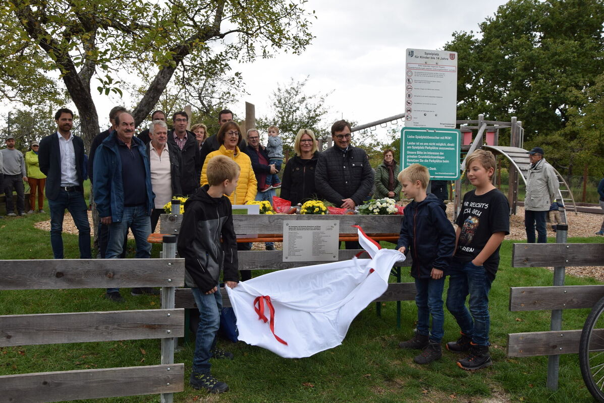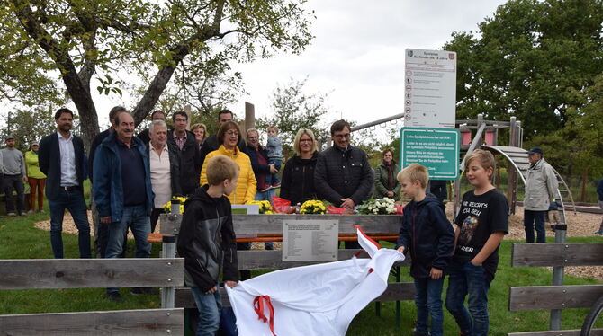 Am Stockacher Spielplatz in der Waldstraße gibt es nun eine Spendertafel. Bei der Eröffnung am Dienstag wurde sie feierlich enthüllt. FOTO: WALDERICH