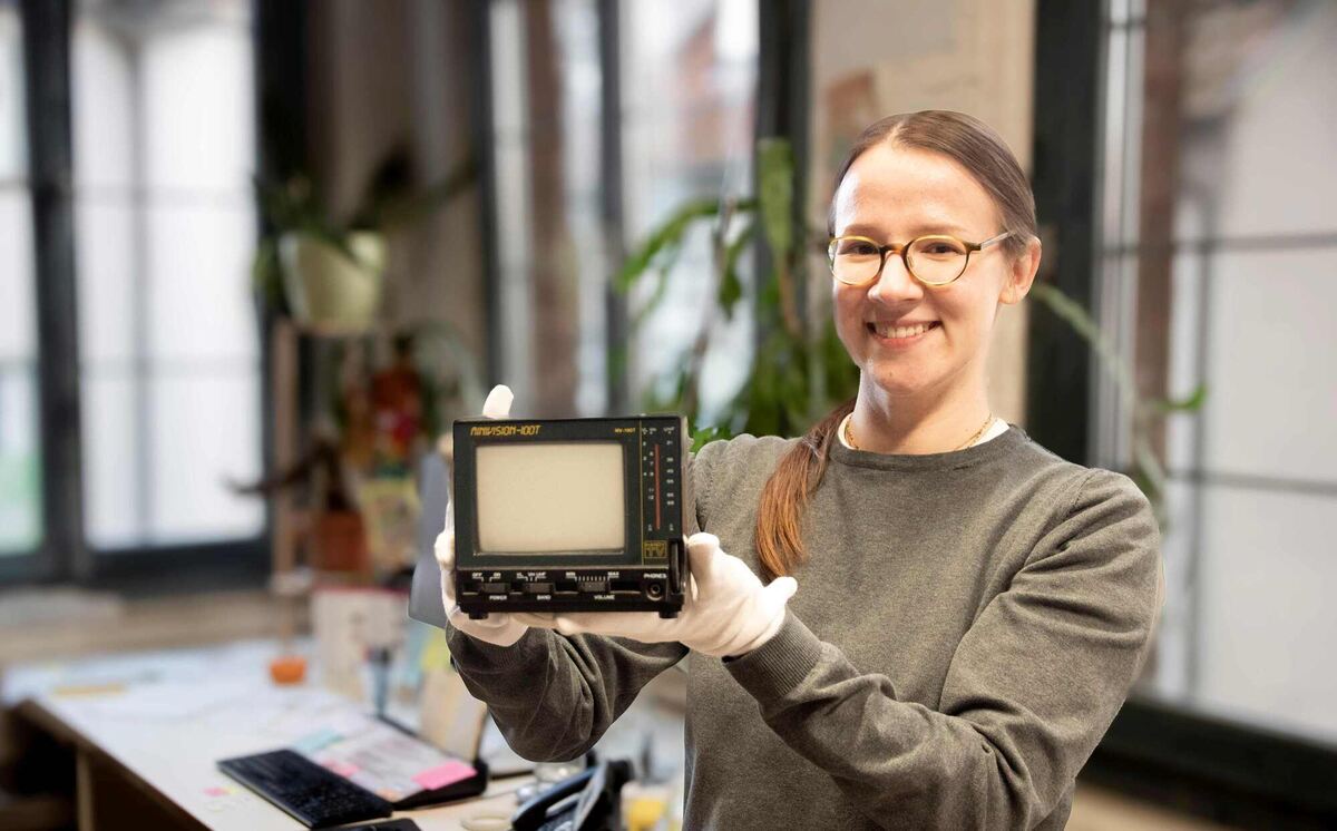 Marina Chernykh im Tübinger Stadtmuseum mit dem kleinen Schwarzweißfernseher, mit dem die Italienerin Antonie Pricci einst Deutsch gelernt hat.