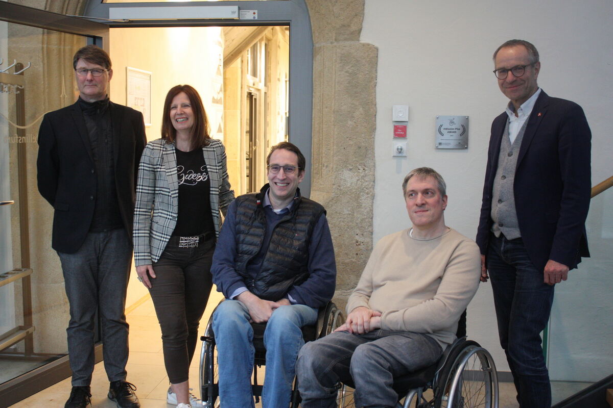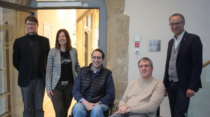 Über die Plakette freuen sich (von links): Architekt Albert Hörz, Sabine Goetz (Landesverband Selbsthilfe Körperbehinderter Menschen), Kreisrat Andreas Braun, Kirchentellinsfurter Behinderten-Beauftragte Mark Schneck und Bürgermeister Bernd Haug.