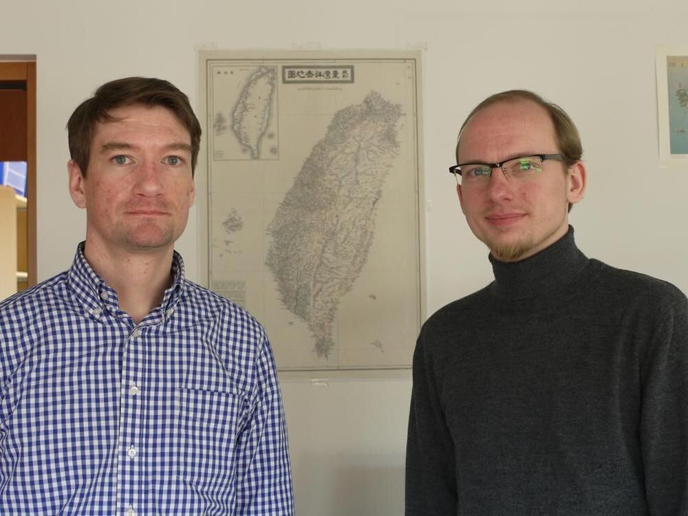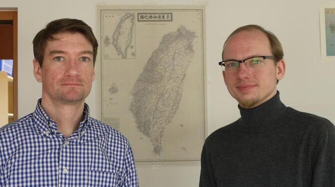 Stefan Braig, geschäftsführender Direktor am ERCCT(links), und André Beckershoff, Doktorand, vor einer Karte von Taiwan. FOTO: GOLZ