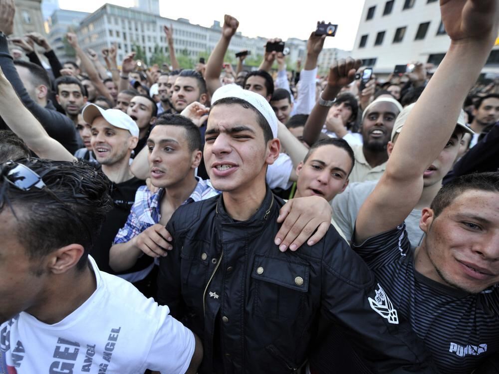 Salafisten jubeln in Frankfurt am Main einem ihrer Prediger zu.