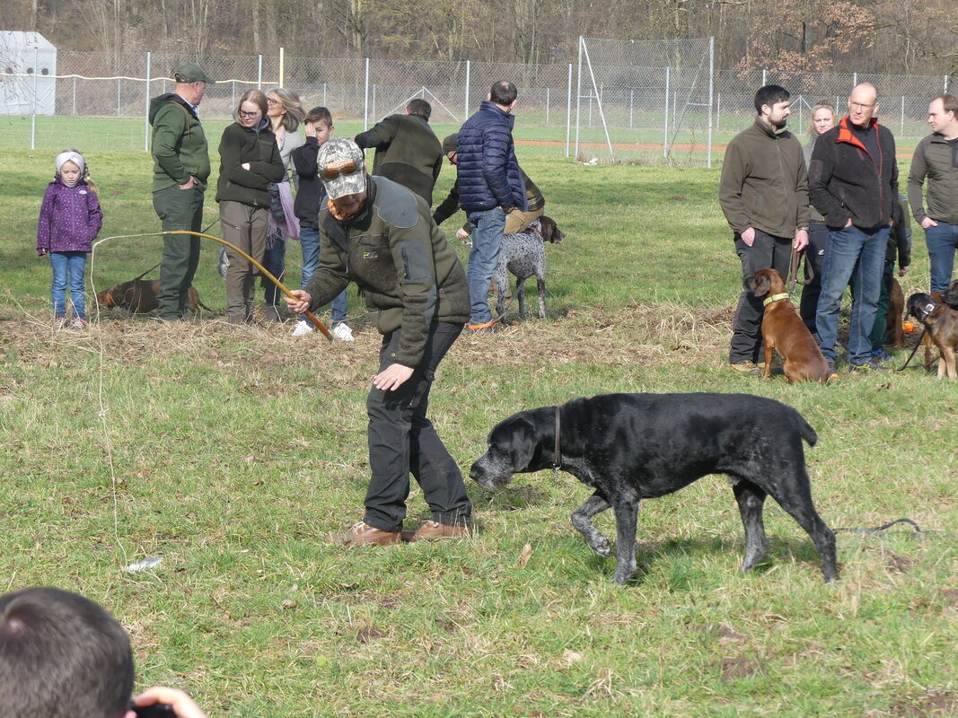Obfrau Stephanie Kerger zeigt, wie sich der Hund einem Beutetier annähern kann.