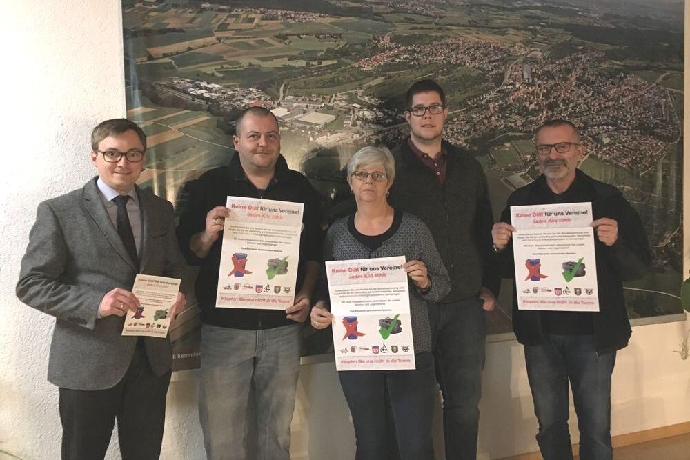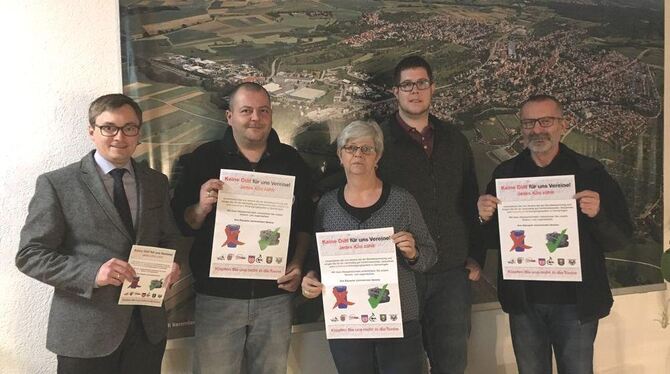 Gomaringer Vereine rufen auf, Altpapier zu bündeln. Von der Gemeinde werden sie dabei unterstützt. Im Bild (von links): Bürgermeister Heß, Jochen Werner, Karin Larsen, Stefan Sälzer und Peter Doller.