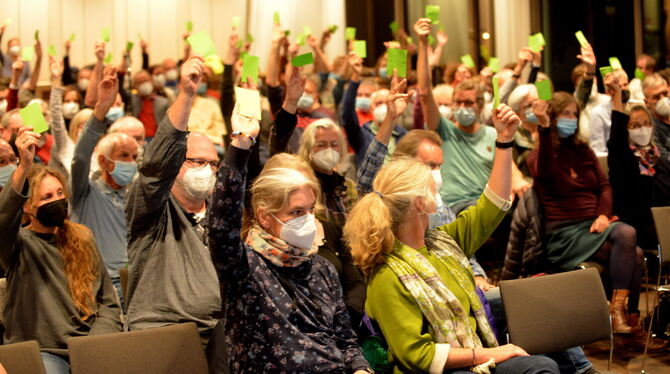 Lauter grüne Kärtchen: Bei nur einer Gegenstimme stimmt die Mitgliederversammlung der Tübinger Grünen für die Urwahl. FOTO: NIETHAMMER