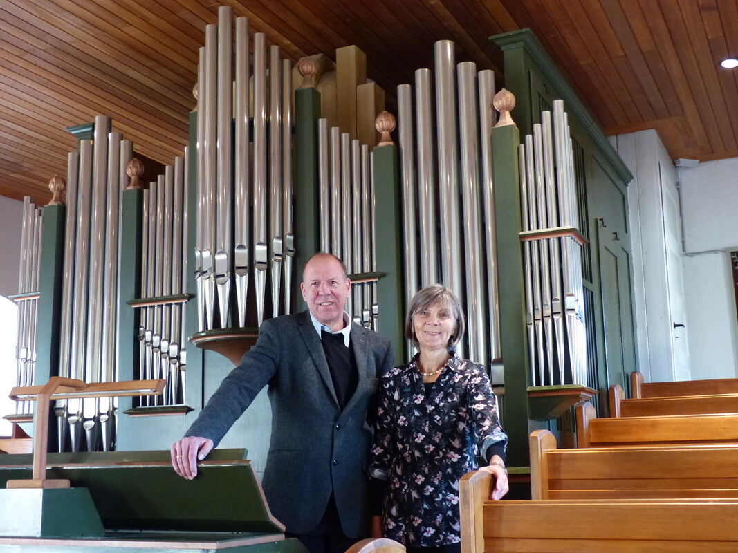 Pfarrer Hans-Michael Wünsch und Organistin Anette Schall vor der Goll-Orgel, die vor 150 Jahren gebaut wurde. FOTO: WEBER