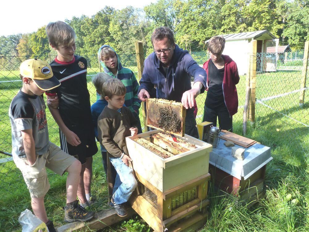 Suche nach der Königin: Der Imker Jens Peter entnimmt aus dem Bienenstock eine Wabe, um sie den Kindern und Jugendlichen auf der Jugendfarm Härten zu zeigen. GEA-FOTO: WEBER