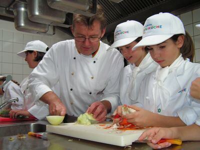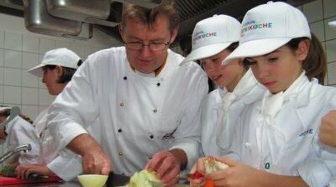 Chefkoch Gerhard Mayer zeigt den Miniköchen, wie man eine Zwiebel würfelt.