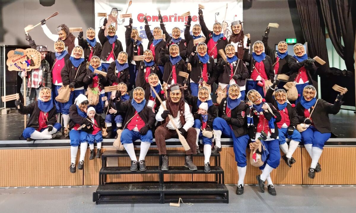 Weiße Mützen, schwarze Jacken, blaue Hosen, rote Westen und eine freundliche Maske: Daran sind die Gomaringer Käsperle zu erkennen. FOTO: VEREIN