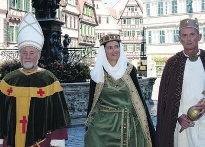 Friedliche Begegnung: Mathilde von Canossa, Papst Gregor VII. (links) und Heinrich IV. posierten am Mittwoch vor dem Tübinger Markt-Brunnen. Als Heinrichs Truppen 1078 die Stadt belagerten, wurde sie erstmals schriftlich erwähnt.