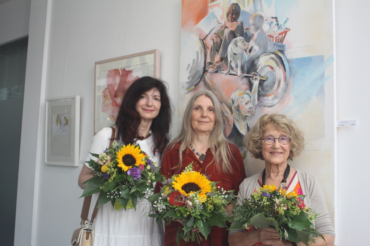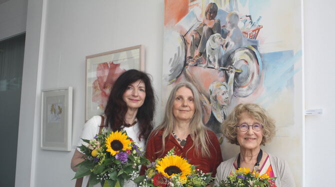 Vernissage in Bad Sebastiansweiler: Henriette Striegler, Annette Jakobi und Livia Schulz-Breznay stellen ihre Werke aus. Letztere malte das Bild »Frauenpower«, das hinter den Dreien zu sehen ist.