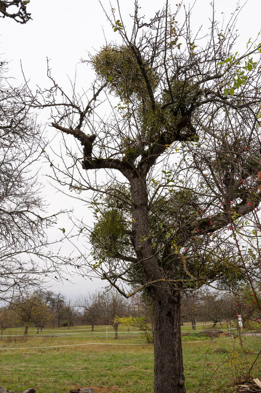 Von Misteln befallener ungepflegter Apfelbaum.