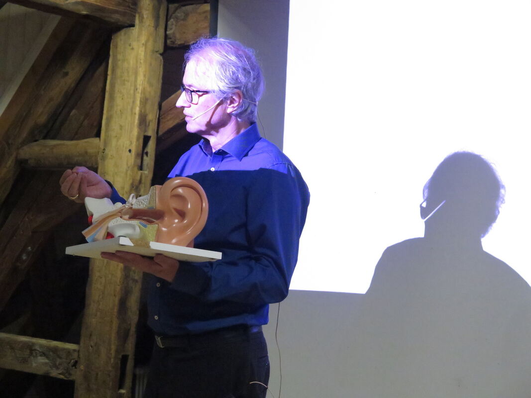 Das Ohr ist ein kompliziertes Gebilde: Rolf-Dieter Nerz über Schwerhörigkeit beim Gomaringer Gesundheitsforum. FOTO: FÖRDER