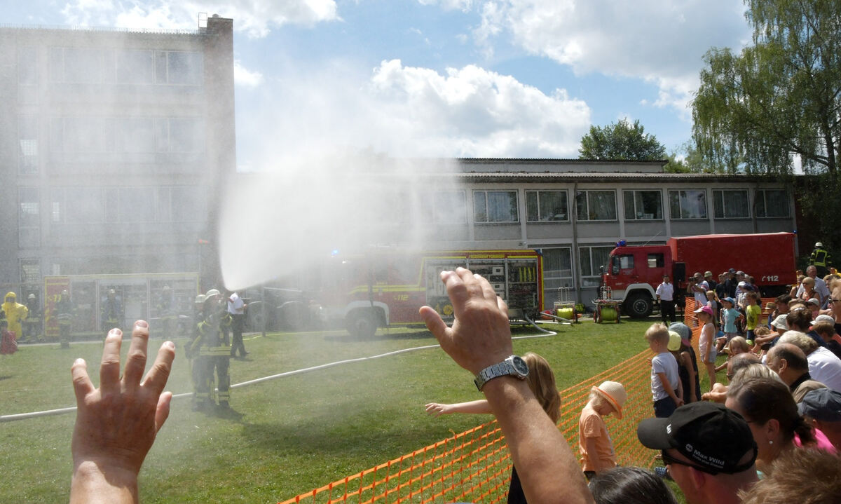 Abkühlung brauchten die Zuschauer beim Jubiläumsfest der Feuerwehr. Hitzig ging’s auch bei der Hauptversammlung zu. FOTO: MEYER