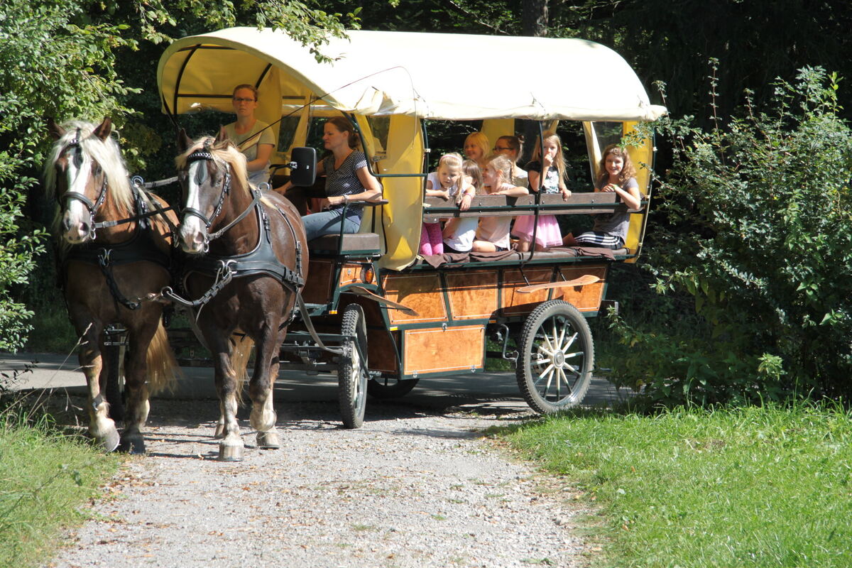 Kinder gehen auf eine sommerliche Kutschfahrt zur Schwefelquelle
