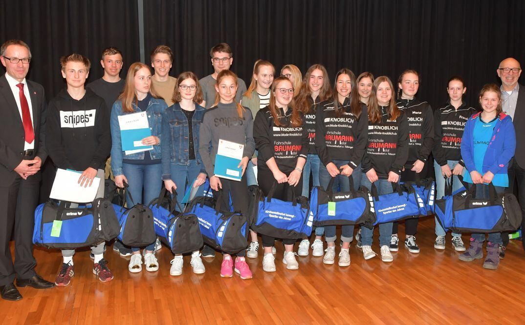 Kirchentellinsfurt bewegt: Sportler, die im vergangenen Jahr auf württembergischen Siegertreppchen standen, wurden beim Bürgerempfang ausgezeichnet. Links Bürgermeister Bernd Haug, rechts Erima-Chef Wolfram Mannherz.