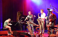 Produktiv an der Leinwand: Werner Rukaber mit zweien seiner vielen Werke, dem dunklen »Seenachtsfest« und einem eher experimentellen Bild ohne Titel.