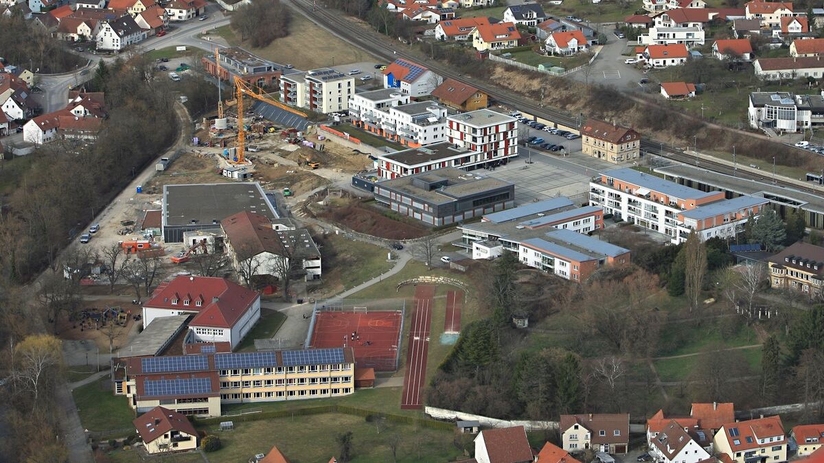 Direkt auf der Grünfläche (Mitte unten) hinter der Anne-Frank-Schule wird das Gebäude der neuen evangelischen Realschule in unmittelbarer Nähe zum Rathaus und zum Bahnhof entstehen. FOTO: GEMEINDE DUßLINGEN
