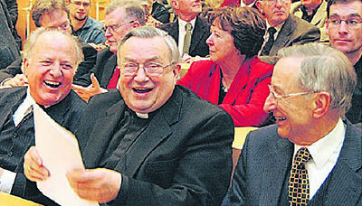 Kritische Bilanz: (von rechts) Der Tübinger Dogmatiker Peter Hünermann mit Karl Kardinal Lehmann und dem Abgesandten des Patriarchen von Konstantinopel, Grigorios Larentzakis. Von Lehmann teilweise verdeckt: Der ehemalige Ministerpräsident »und jetzige Philosophiestudent im ersten Semester«, Erwin Teufel.