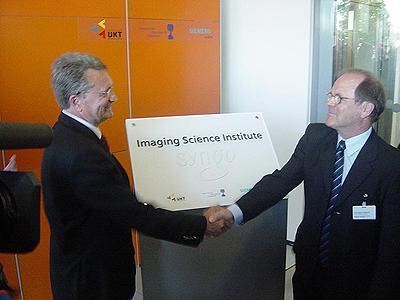 Ein Händedruck für engere Zusammenarbeit: Die Professoren Claus Claussen (links) und Erich Reinhardt (Siemens).