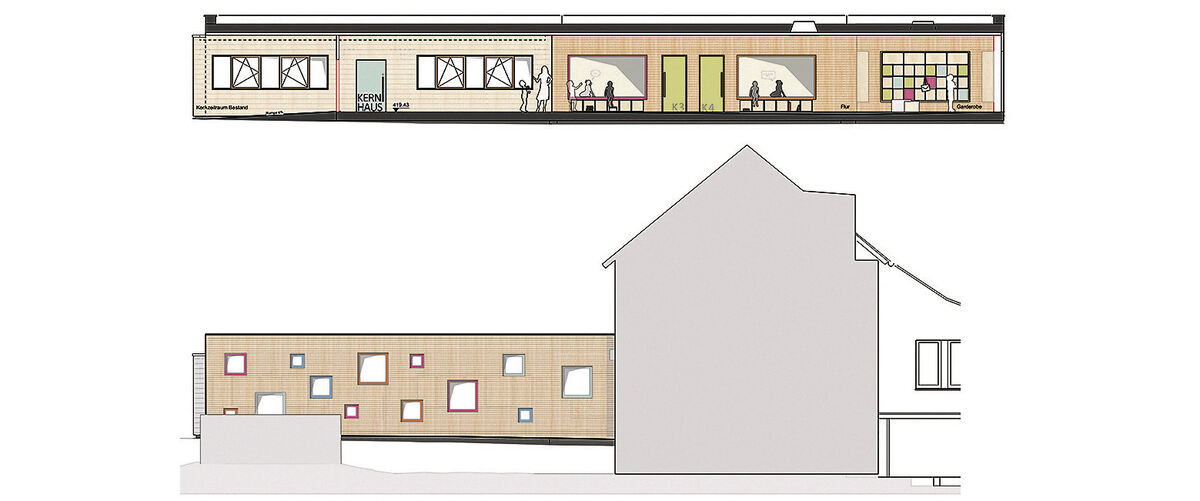 Der Anbau (oben rechts der Flur) an den bestehenden Kernzeitpavillon soll in einem späteren Abschnitt mit dem Schulneubau verbunden werden (unten).