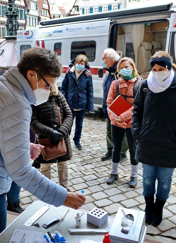 Christa Lucke (links) schult Betreuungspersonal im Corona-Schnelltest auf dem Tübinger Marktplatz. Auch in den umliegenden Gemeinden muss das Personal nun geschult werden, damit in den Kindergärten getestet werden kann.